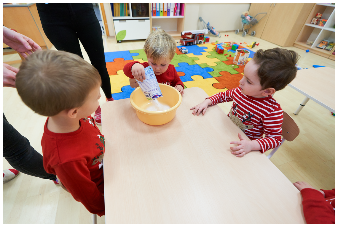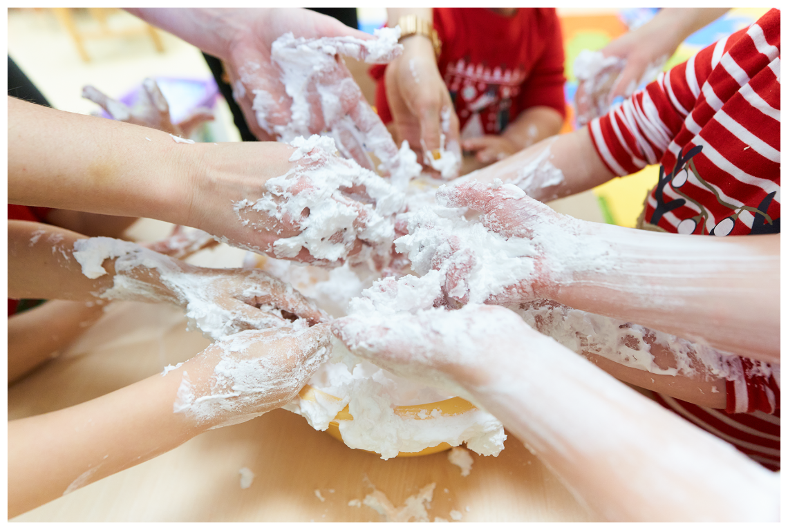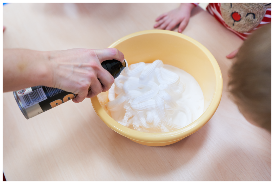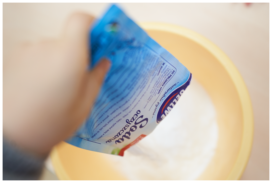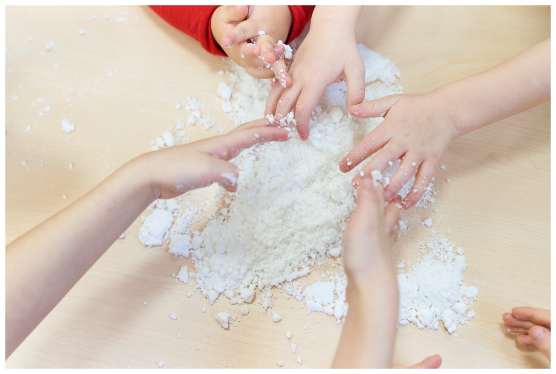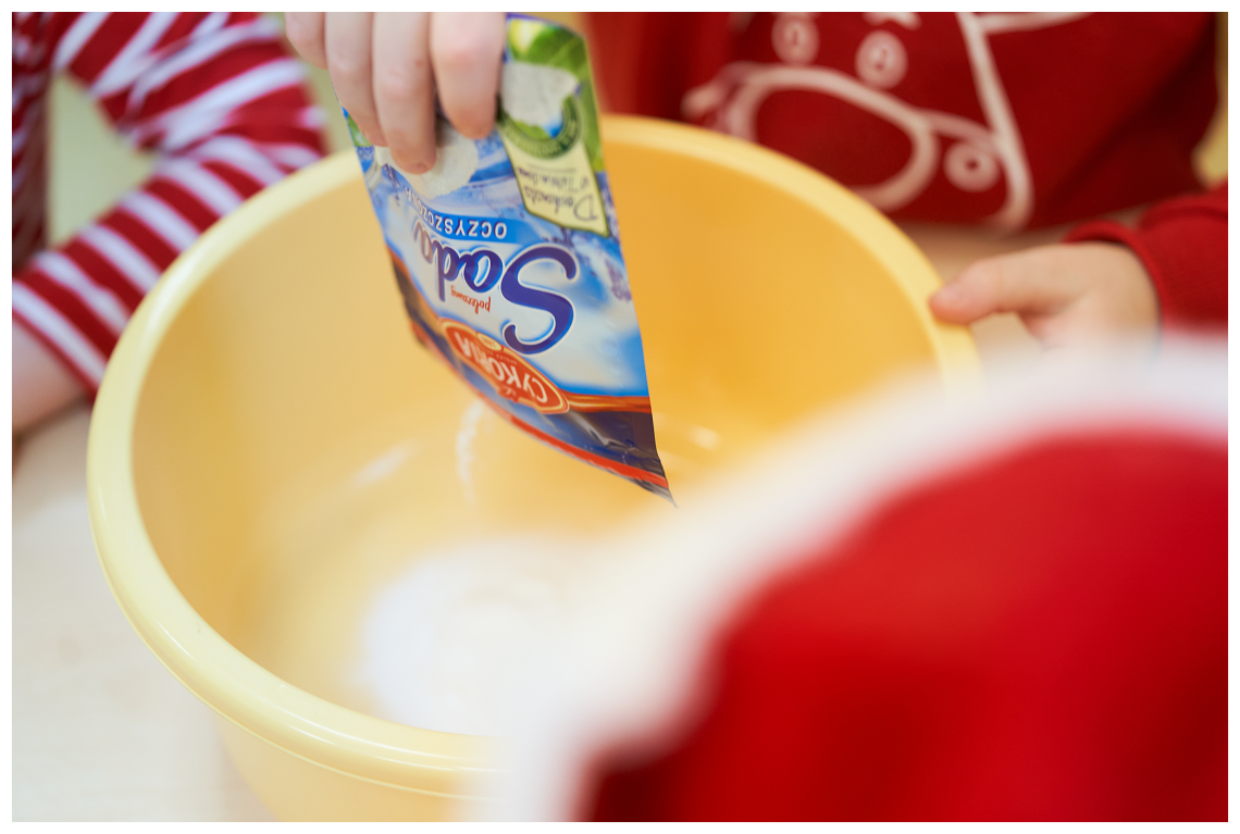 W ostatnich dniach, śniegu za oknem nie widać, dlatego postanowiliśmy zrobić swój własny biały puch. Przepis na taki śnieg jest banalnie prosty. Przyda się pianka do golenia, której używa Tata i soda oczyszczona, którą pewnie gdzieś przy akcesoriach kuchennych przechowuje Mama. W przedszkolu o wszystkie składniki zadbały Panie, więc nikomu nie trzeba było nic „podbierać”.