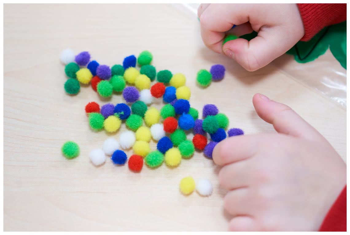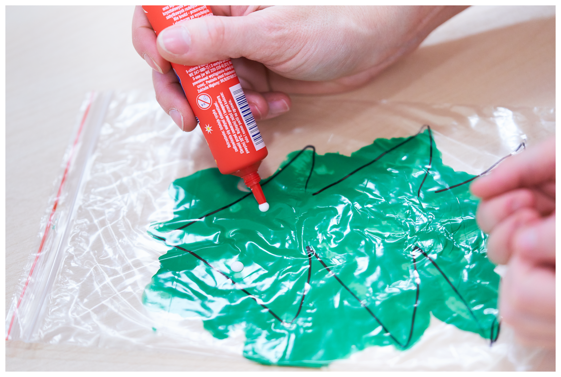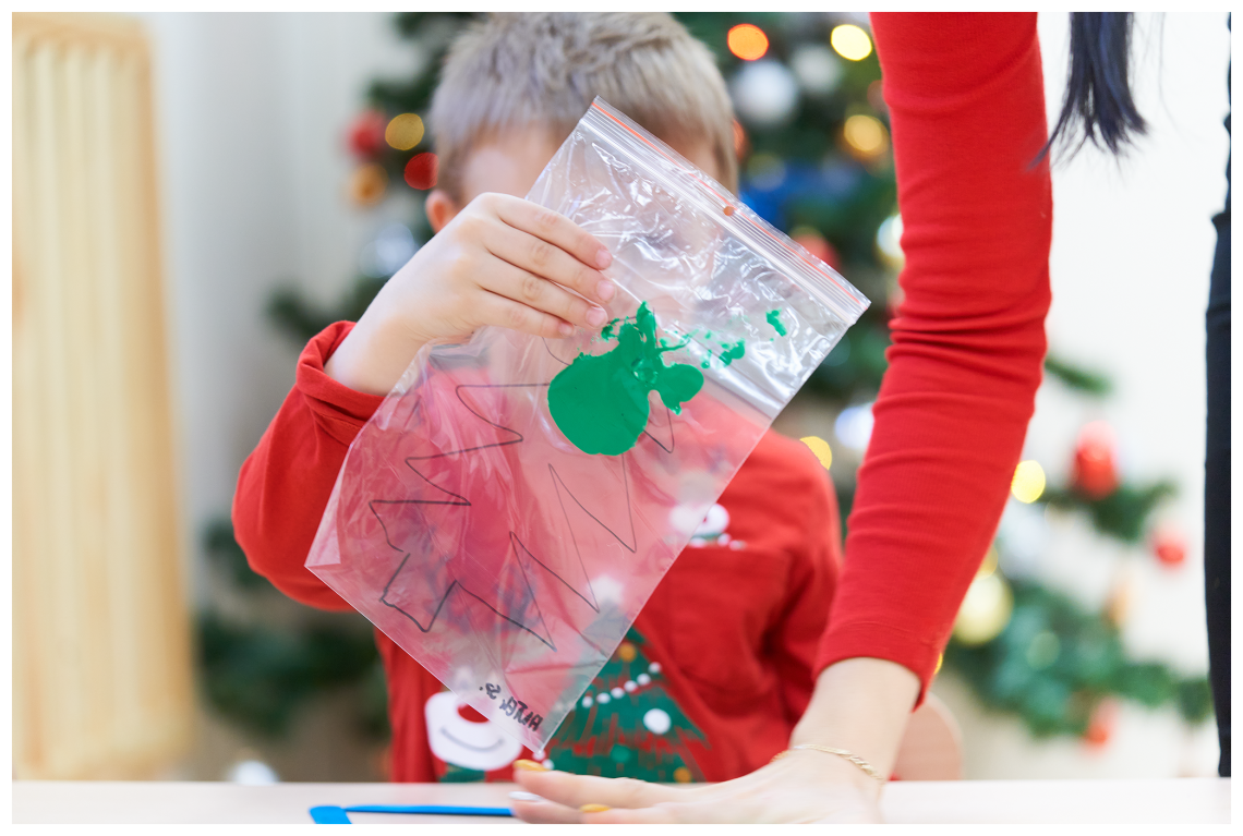 Ugniatanie masy śniegowej jest ciekawym doświadczeniem dla małych rączek, zupełnie innym niż lepienie z plasteliny. Po wymieszaniu sody z pianką można taką masę przetrzymać chwilę w lodówce. Wtedy nasz śnieg rzeczywiście będzie zimny! Farby natomiast użyliśmy do wykonania choinek ukrytych w foliowym woreczku. Rozcieranie jej nie było łatwe, ale warto było się pomęczyć, zwłaszcza że na końcu swoje drzewko mogliśmy ozdobić małymi puchowymi bombkami. Inny sposób na zrobienie kolorowych choinek, to połączenie drewnianych patyczków w trójkąty.