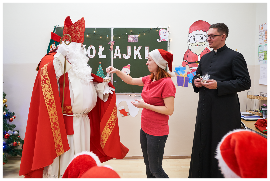 Przyjrzeliśmy Mu się z bliska. Jego ubiór różni się od stroju mikołajów, których spotykamy przed Bożym Narodzeniem w mieście, sklepach czy w reklamach. Na głowie nie miał czapki zakończonej białym pomponem, tylko biskupią mitrę, a w ręku trzymał pastorał. Ktoś, kto nie był grzeczny może pomylić taki "pasterski kij" z rózgą, ale na szczęście, nasze dzieci takich skojarzeń nie miały...